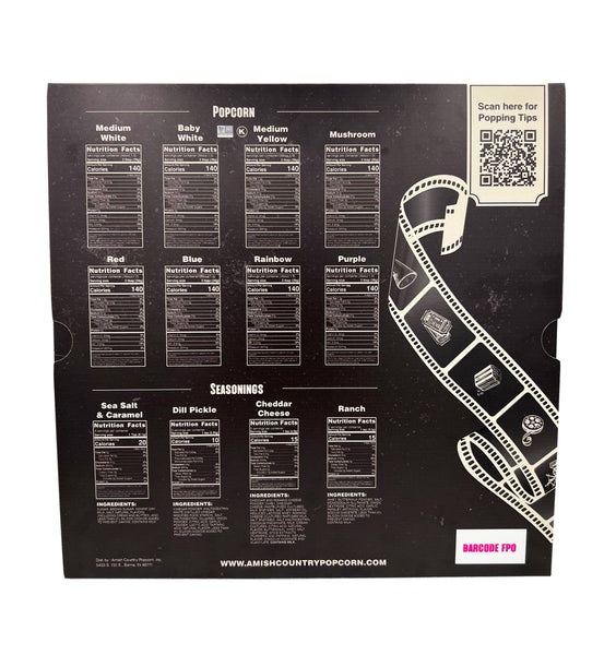 This set is perfect for any movie night! Enjoy a sampling of what we have to offer at Amish Country Popcorn. The Movie Night Variety Pack contains the following: 8 - 2oz Assorted Bags of Popcorn Kernels & 4 - 1oz Bags of Assorted Seasonings Popcorn Varieties: Medium White, Baby White, Medium Yellow, Mushroom, Red, Blue, Rainbow, Purple. Seasonings: Sea Salt & Caramel, Dill Pickle, Cheddar Cheese, Ranch