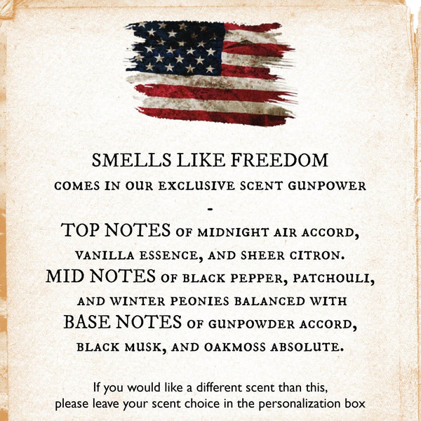 Celebrate our Independence with our exclusive "Smells Like Freedom" candle, a perfect addition to your 4th of July festivities. Hand-poured in Bixby, OK, this pure soy candle captures the essence of patriotism with its complex and evocative fragrance. Top notes of midnight air accord, vanilla essence, and sheer citron provide a fresh and invigorating opening, while mid notes of black pepper, patchouli, and winter peonies add a rich, floral depth. The scent is balanced with base notes of gunpowder accord, black musk, and oakmoss absolute, evoking the thrilling atmosphere of fireworks lighting up the night sky. The clean, long-lasting burn of our high-quality soy wax ensures you can enjoy this delightful aroma throughout your celebrations.